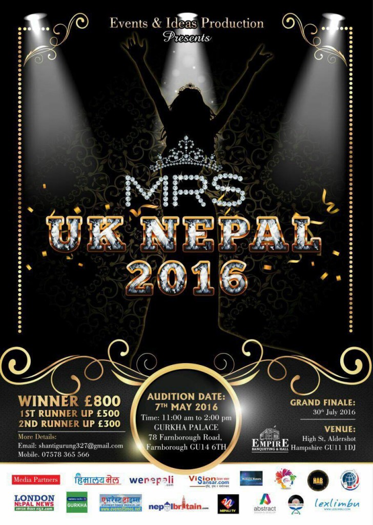 लन्डन । इभेन्ट्स एण्ड आइडियाज् प्रोडक्शनले बेलायतमा पहिलो पटक मिसेस यूके नेपाल २०१६ प्रतियोगिता गर्ने भएको छ ।