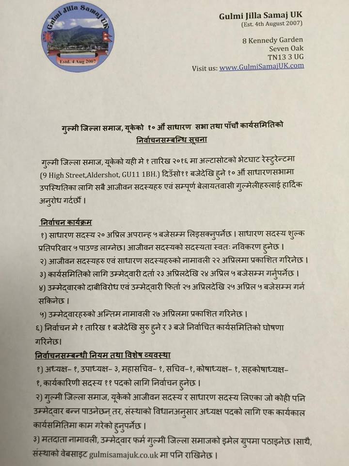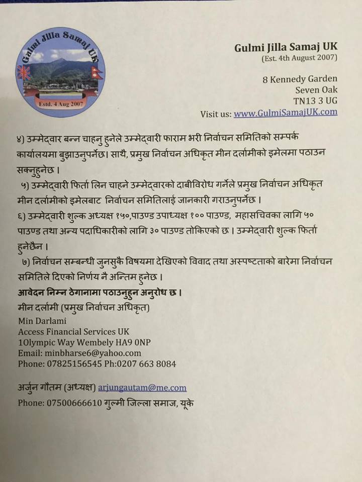 लन्डन- गुल्मी जिल्ला समाज, यूकेको निर्वाचन कार्यक्रम सार्वजनिक भएको छ ।