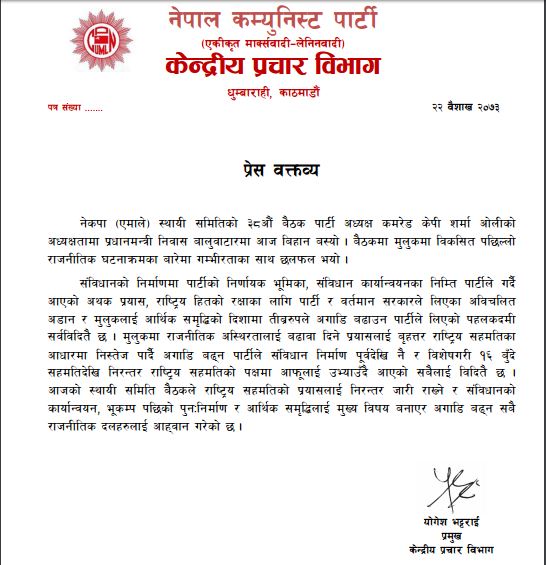 एमालेको निर्णयमा भनिएको छ ‘आजको स्थायी समिति बैठकले राष्ट्रिय सहमतिको प्रयासलाई निरन्तर जारी राख्ने र संविधानको कार्यान्वयन, भूकम्प पछिको पुनःनिर्माण र आर्थिक समृद्धिलाई मुख्य विषय बनाएर अगाडि बढ्न सबै राजनीतिक दलहरुलाई आह्वान गरेको छ’ बैठकपछि एमाले सचिव योगेश भट्टराईले जारी गरेको विज्ञप्तीमा भनिएको छ।