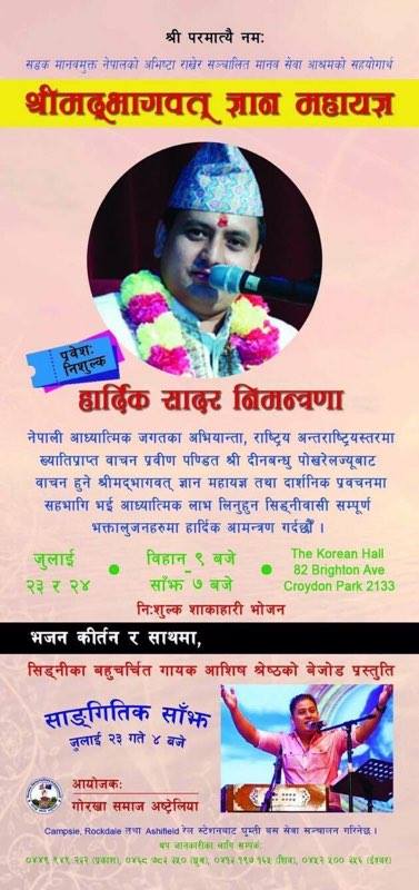 २३ र २४ जुलाइमा दी कोरियन हल, ८२ व्रिटहोन एभ, क्रोइडन पार्क एनएसडब्वलु २१३३ मा हुन गइरहेको महायज्ञमा अष्ट्रेलियाभरि रहेका नेपाली सहभागी हुने आयोजक गोरखा समाजले जनाएको छ ।