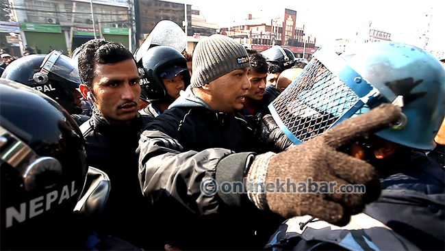 तर, उनीहरु र नजिकै रहेका बन्दकर्तावीच भनाभन र धकेलाधकेल भयो । दुईपक्षीय मुठभेडलाई रोक्न प्रहरीलाई हम्मेहम्मे पर्यो । यस्तै घटना राजधानीका अन्य ठाउँमा पनि भए । प्रहरीले पूर्वनिर्धारित बन्दका कार्यक्रममा त्यसरी सडकमा नउत्रिदिन र हटिदिन आग्रह गरिरहेको थियो भने बन्दकर्ताहरु संविधानमा आफ्नो हक सुनिश्चित गर्न राजनीतिक कारणले सडकमा उत्रेको जिकिर गरिरहेका थिए ।