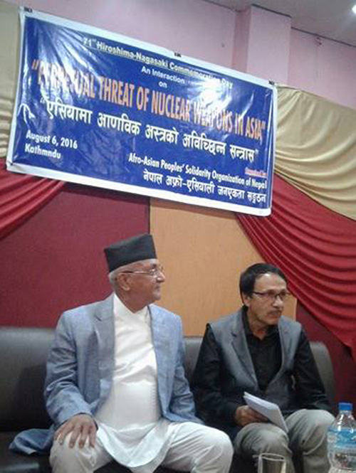 जापानको हिरोसिमा र नागासाकीमा एटम बम हमला भएको ७१औँ स्मृति वर्षका सन्दर्भमा आज यहाँ नेपाल अफ्रो–एसियाली जनएकता सङ्गठन (आप्सो)ले आयोजना गरेको ‘एसियामा आणविक अस्त्रको अविछिन्न सन्त्रास’ विषयक गोष्ठीमा अध्यक्ष ओलीले जहाँ पुग्यो त्यहीँ प्रेम (लभ) गर्नेहरुसँगको सङ्गतका कारण आफू सरकारबाट बाहिरिनुपरेको टिप्पणी गर्नुभयो ।