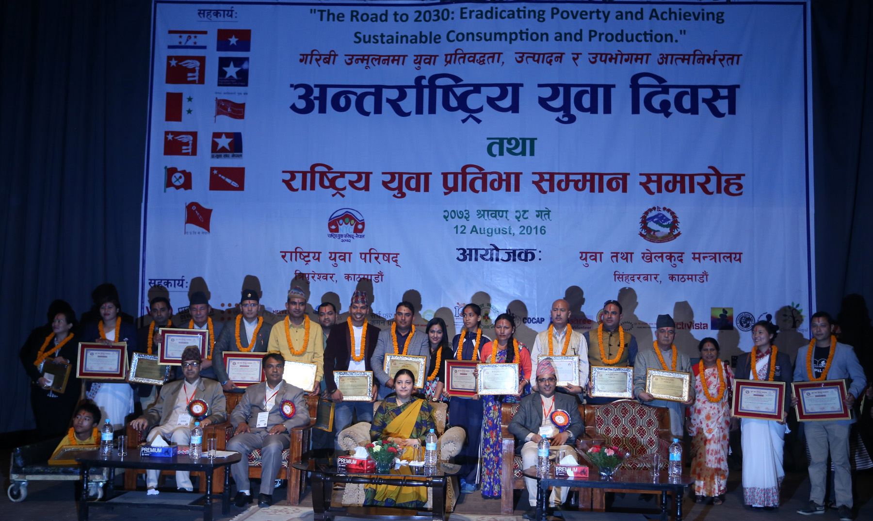 अन्तर्राष्ट्रिय युवा दिवसको सन्दर्भ पारेर राष्ट्रिय युवा परिषद्ले आयोजना गरेको कार्यक्रममा सम्मानित हुनेमा समाजसेवा क्षेत्रका लागि हास्य कलाकार जोडी सीताराम कट्टेल ‘धुर्मुस’ र कुञ्जना घिमिरे जोडीको धुर्मुस–सुन्तली फाउन्डेसन, व्यावसायिक कृषिबाट गुल्मीको पैँचो पसल प्रालि, वातावरण तथा सरसफाइका लागि खाँदबारी, सङ्खुवासभाका डा राजु अधिकारी छन् ।