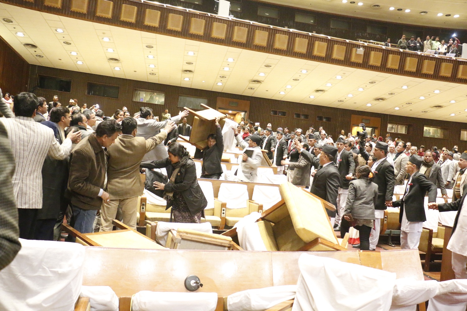 तर घोषणापछि पनि झडप रोकिएन। विपक्षी सभासद्हरुले कुर्सी उचाल्दै भूँइमा बजारिरहेको दृश्य निकै अबेरसम्म देखिएको थियो। ‘संविधान सभाका दलालहरु मूर्दावाद’ नारा लगाउँदै सभासद्हरुले लामै समय उपद्रो मच्चाए।
