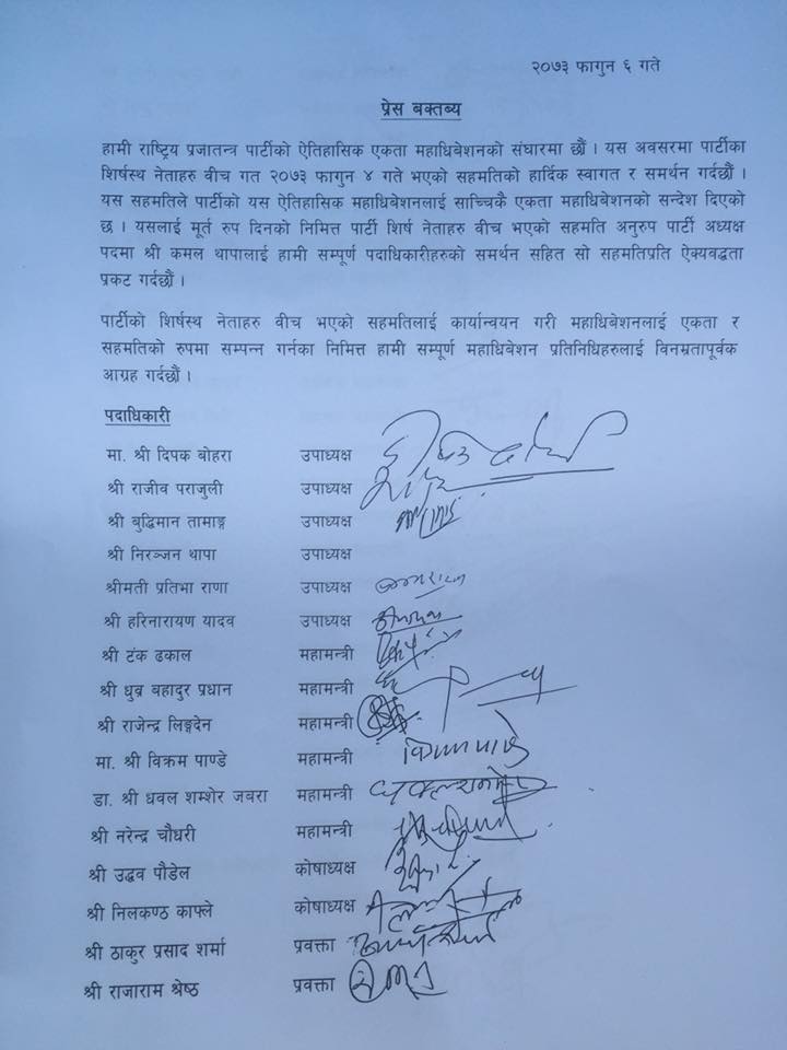 उनीहरुले जारी गरेको विज्ञप्तिमा पार्टीका शीर्ष नेताहरुबीच फागुन ४ गते भएको सहमतिअनुसार आफूहरुको थापालाई समर्थन रहने उल्लेख गरिएको छ ।