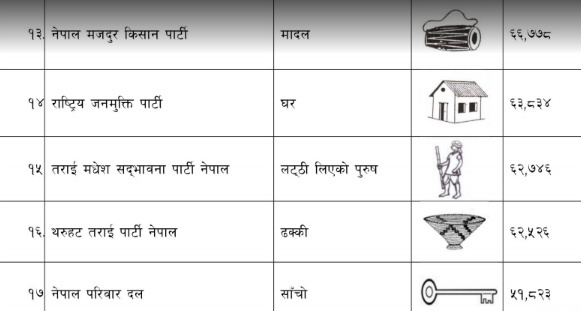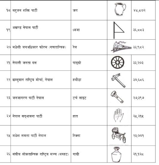 जसअनुसार एक नम्बरमा कांग्रेसको चुनाव चिन्ह परेको छ भने एमालेको दुई तथा माओवादी केन्द्र र राप्रपाको क्रमशः तीन र चार नम्बरमा परेको छ ।