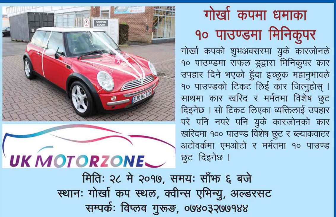 क्याबर्लीस्थित कार बिक्रेता कम्पनी युके कार जोनले १० पाउण्डको राफल ड्रमा मिनी कुपर राखेको हो । साथै सो राफल ड्रमा युके कार जाेनबाट कार खरिदमा १०० पाउण्ड तथा ब्ल्याकबाटर अटाेवर्कमा कार मर्मत र एमओटीमा १० पाउण्डको गिफ्ट भौचरसमेत राखिएको कार जोनका निर्देशक विप्लव गुरुङले बताए । सो राफल टिकट गोरखा कपमा रहेको कार जोनको स्टलबाट किन्न सकिने बताइएको छ भने त्यसअघि विभिन्न नेपाली पसलहरुबाट पनि खरिद गर्न सकिने गुरुङले जानकारी दिए ।