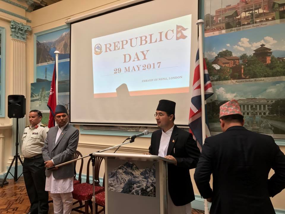लन्डन । लन्डनस्थित नेपाली दूतावासमा सोमबार दशौं गणतन्त्र दिवस मनाइएको छ । सयौं नेपाली तथा विदेशी सहभागी उक्त कार्यक्रममा राजदूत डा. दुर्गाबहादुर सुवेदीले नेपालमा गणतन्त्रको अभ्युदय र नागरिक हक अधिकार प्राप्तिका निम्ति जीवन उत्सर्ग गर्ने प्रातः स्मरणीय शहीदहरुमा श्रद्धान्जली अर्पण गर्दै गणतन्त्र दिवसले लोकतान्त्रिक गणतन्त्रको उज्यालोमा नेपाल आर्थिक समृद्धि, सामाजिक रुपान्तरण र राजनीतिक स्थायित्वको महान गन्तव्यमा पुग्ने विश्वास व्यक्त गरे । राजदूत सुवेदीले गणतन्त्र दिवसका अवसरमा राष्ट्रपति विद्यादेवी भण्डारी र प्रधानमन्त्री पुष्पकमल दाहालले दिएको सन्देश पनि सुनाएका थिए । नेपालमा संघीय लोकतान्त्रिक गणतन्त्र घोषणा भएको ऐतिहासिक दिनको सम्झनालाई चिरस्थायी बनाउन नेपाल सरकारले प्रत्येक वर्ष जेठ १५ लाई गणतन्त्र दिवसका रुपमा मनाउंदै आएको छ ।