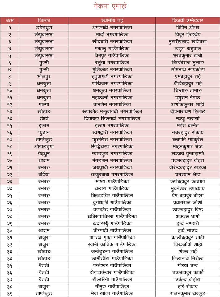 पछिल्लो मत परिणाम अनुसार नेकपा एमालेले १०१ स्थानमा जीत हासिल गरेको छ । यसमध्ये एमालेले २२ वटा नगरपालिका र ७९ वटा गाउँपालिकामा जीत हासिल गरेको छ ।