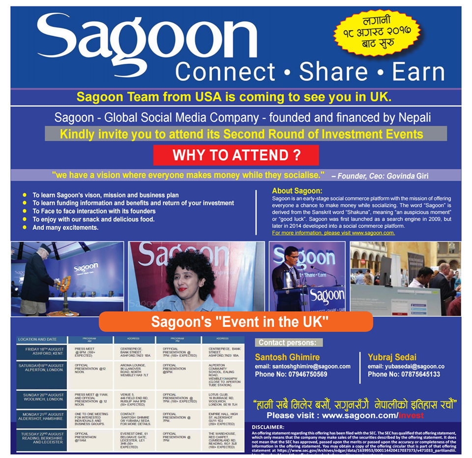 लन्डन– नेपालीहरुको लगानी रहेको ग्लोबल सोसल साइट सगुन डट कमको मेगा लन्च लन्डनमा हुने भएको छ । घोषणापछि दोस्रो चरणको लगानी लगानीको अवसर खुला हुनेछ ।