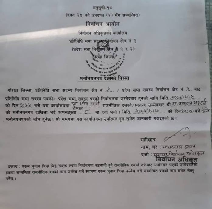 आइतबार दिउँसो दलबलसहित जिल्ला निर्वाचन कार्यालयमा पुगेर भट्टराईले उम्मेदवारी दर्ता गराएका हुन् । भट्टराईको मनोनयन दर्ता क्रम संख्या ८ रहेको छ ।