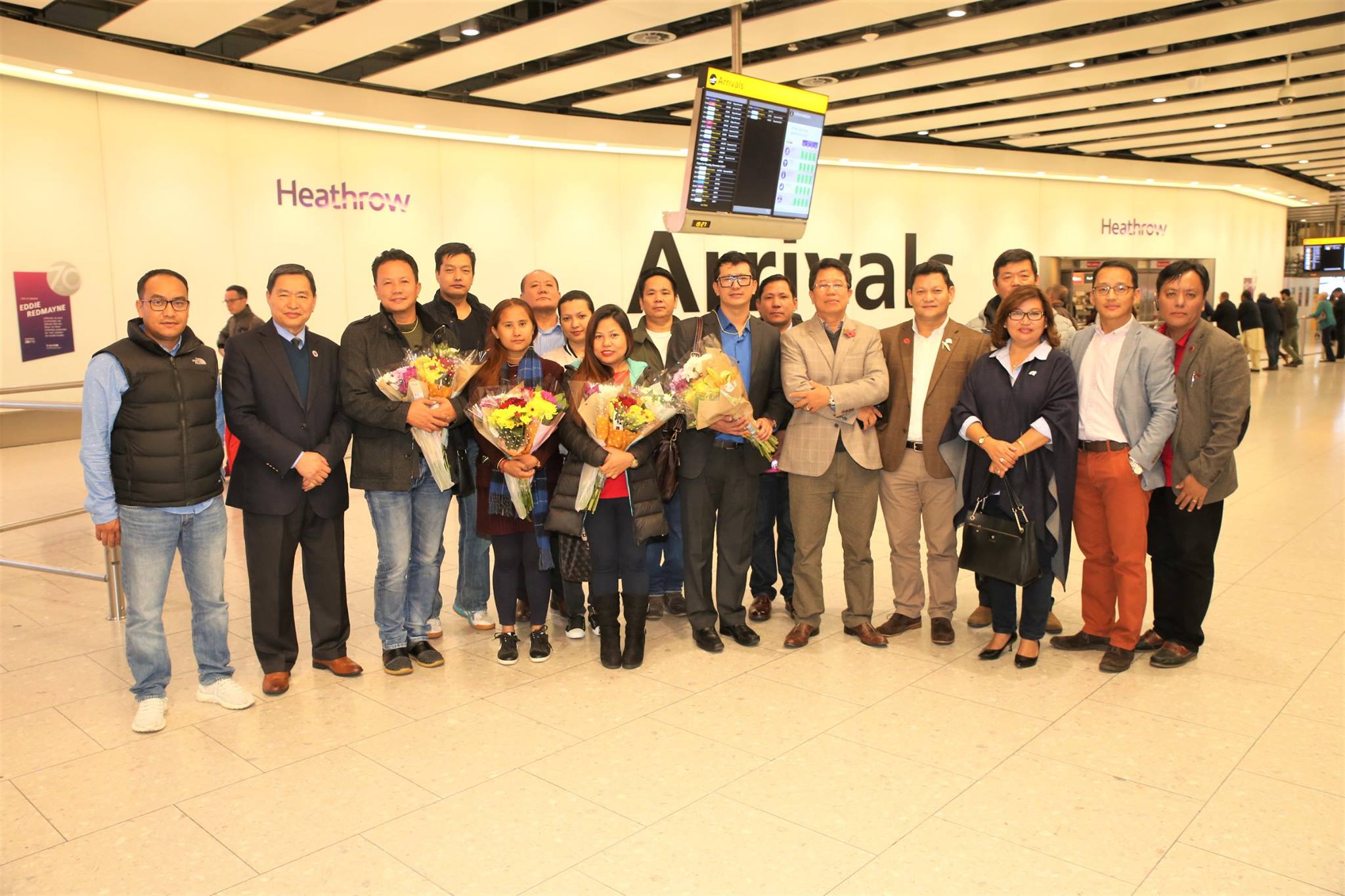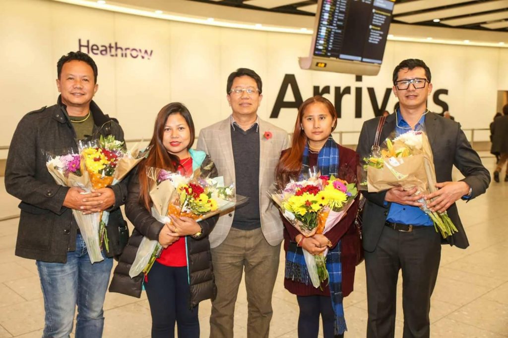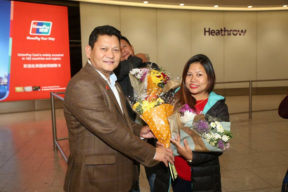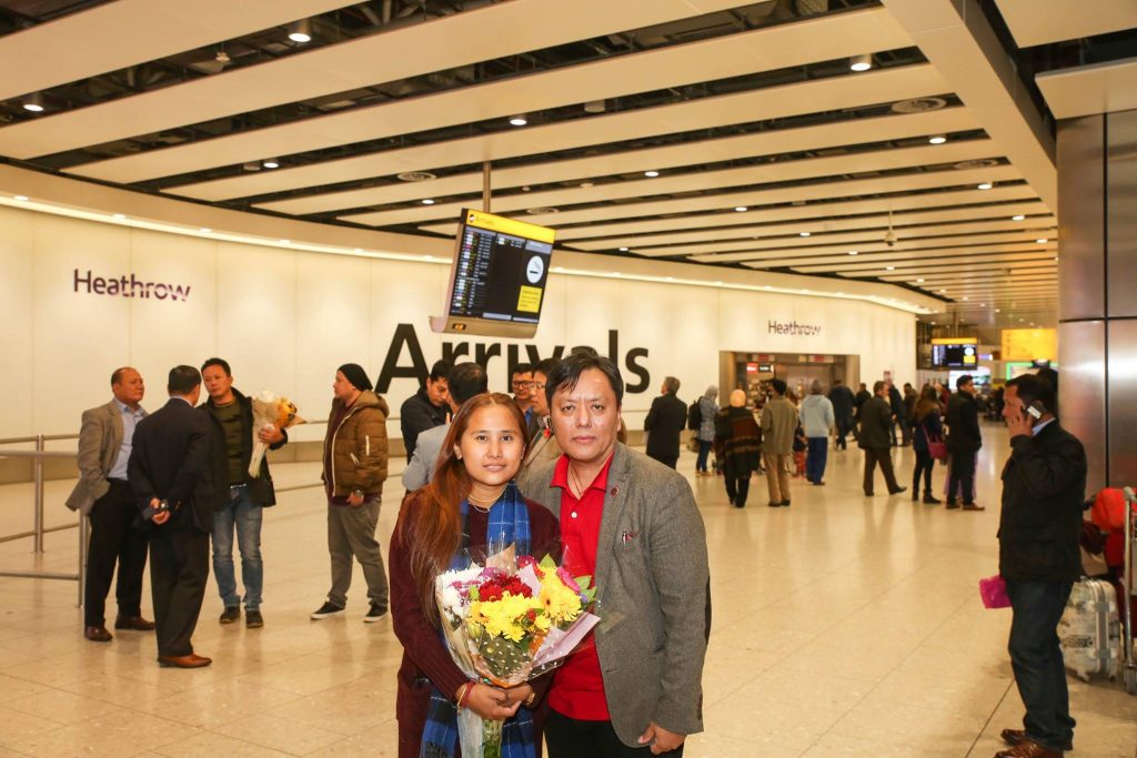 तमु प्ये ल्हु संघ युकेका अध्यक्ष मेजर खुशीमान गुरुङ, क्या. डेमबहादुर गुरुङ, इन्जिनियर बिजय गुरुङ, संस्थापक अध्यक्ष अशोक गुरुङ, उपाध्यक्ष पूर्ण बहादुर गुरुङ र फोटोपत्रकार मिलन तमु समेतले हिथ्रो विमानस्थल पुगेर खादा र फुलमालाले कलाकारको स्वागत गरे ।