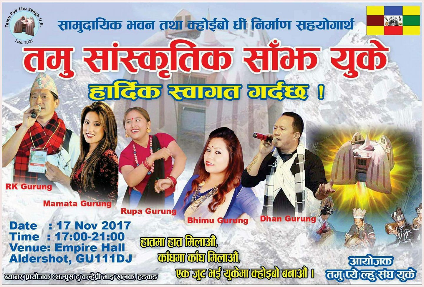 संघको आयोजनामा आगामी १७ नोभेम्बर को सांझ अल्डरसटस्थित एम्पायर हलमा कार्यक्रम आयोजना हुंदैछ । तमु प्ये ल्हु संघको सामाजिक भवन निमार्ण सहयोगार्थ कार्यक्रम गर्न लागिएको हो ।