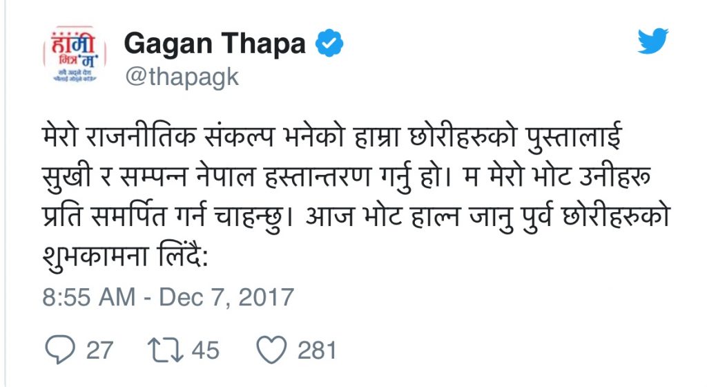 काठमाडौं। मतदान गर्न जानुअघि कांग्रेस नेता गगन थापाले गरेको ट्वीट तत्कालै भाइरल भएको छ । उनले अतदान गर्न जानुअघि आफ्नो परिवारसँगै भएको फोटो पोस्ट गर्दै ट्वीट गरेका थिए । उनले यो ट्वीट गर्नासाथ लगातार रिट्वीट भइरहेको छ । गगनले ट्वीटमा ‘मेरो राजनीतिक संकल्प भनेको हाम्रा छोरीहरुको पुस्तालाई सुखी र सम्पन्न नेपाल हस्तान्तरण गर्नु हो। म मेरो भोट उनीहरू प्रति समर्पित गर्न चाहन्छु। आज भोट हाल्न जानु पुर्व छोरीहरुको शुभकामना लिंदै:’ भनेर लेखेका छन् ।