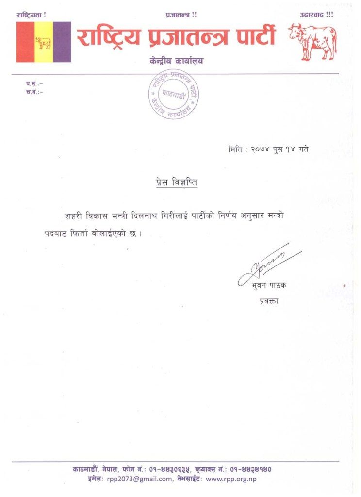 राप्रपा नेपालले जारी गरेको विज्ञप्तिमा पार्टीको निर्णय अनुसार मन्त्रीबाट फिर्ता गराइएको उल्लेख छ । पार्टी अध्यक्ष कमल थापाले सहरी विकासमन्त्री गिरीलाई बर्खास्त गर्न प्रधानमन्त्रीलाई पत्र पठाएका छन् ।