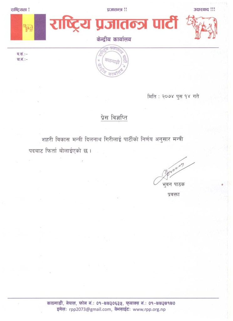 काठमाडौं- राष्ट्रिय प्रजातन्त्र पार्टी (राप्रपा)ले सहरी विकासमन्त्री दिलनाथ गिरीलाई फिर्ता बोलाएको छ ।