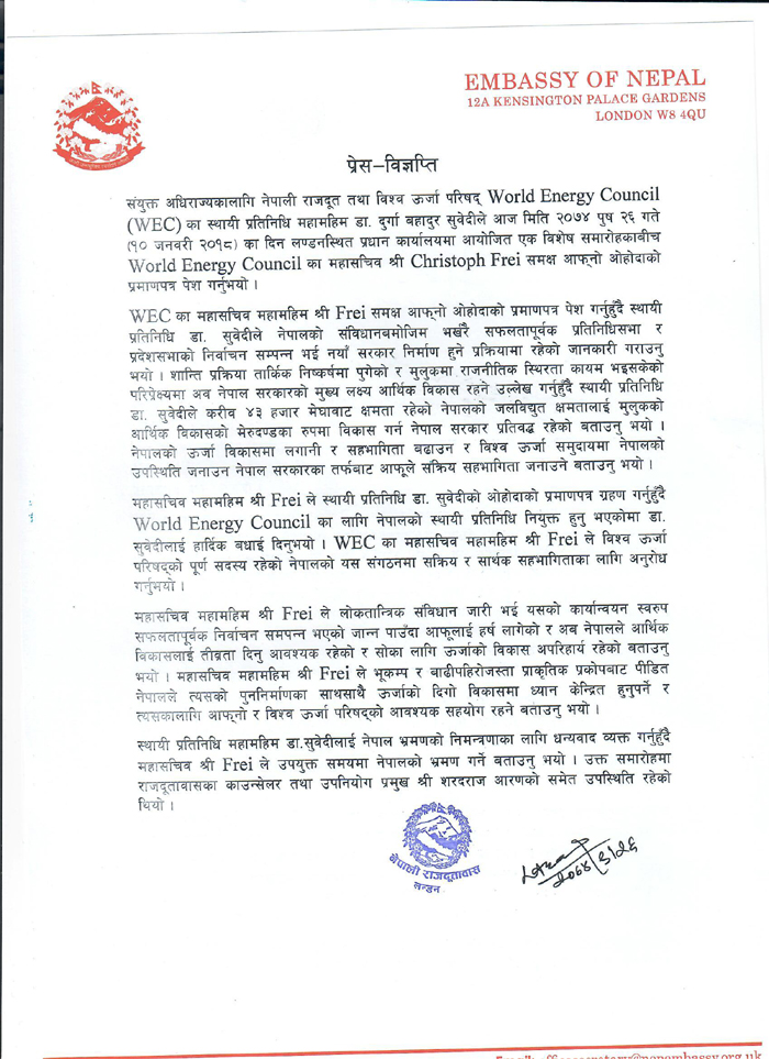 विश्व ऊर्जा परिषदका स्थायी प्रतिनिधिसमेत रहेका राजदूत सुवेदीले फेरीसमक्ष ोहोदाको प्रमाणपत्र पेस गर्दै नेपालमा हालै भएको प्रतिनिधिसभा तथा प्रदेशसभाको निर्वाचन सफलतापूर्वक सम्पन्न भएको जानकारी गराए ।