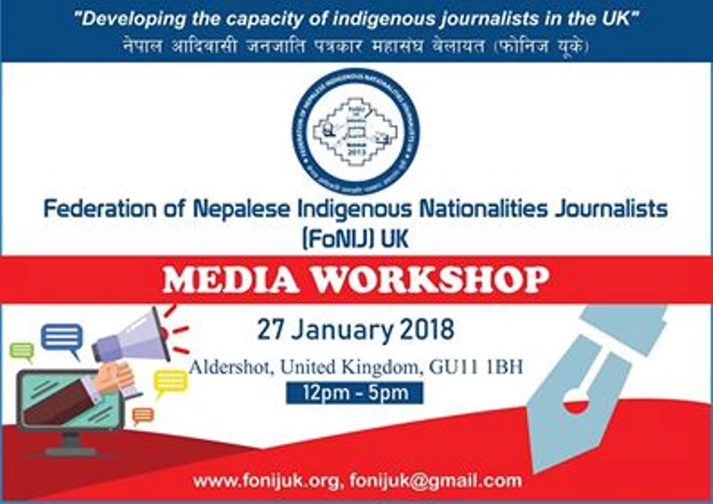 अल्डर्सटको भेटभाट रेष्टुरेन्टमा आयोजना गर्न लागिएको सो गोष्ठीमा आदिवासी जनजाती पत्रकारहको क्षमता विकासमा जोड दिइनेछ । फोनिज यूकेका अध्यक्ष प्रर्मिला राईका अनुसार गोष्ठीमा पत्रकारिताका विशेषज्ञहरुले प्रशिक्षण दिने कायक्रम रहेको छ ।