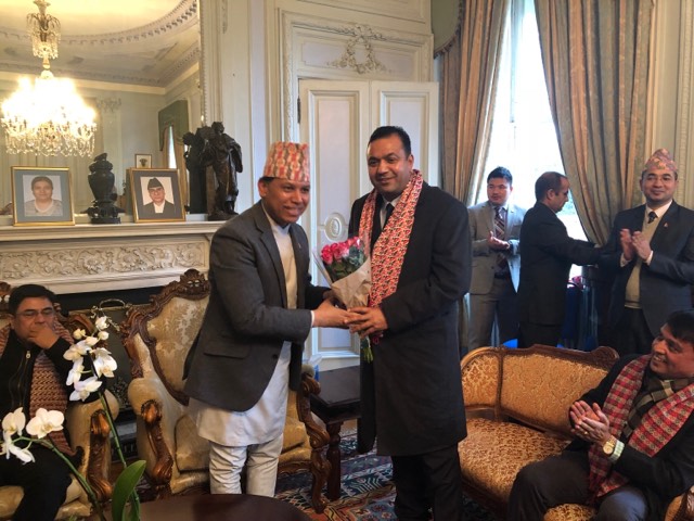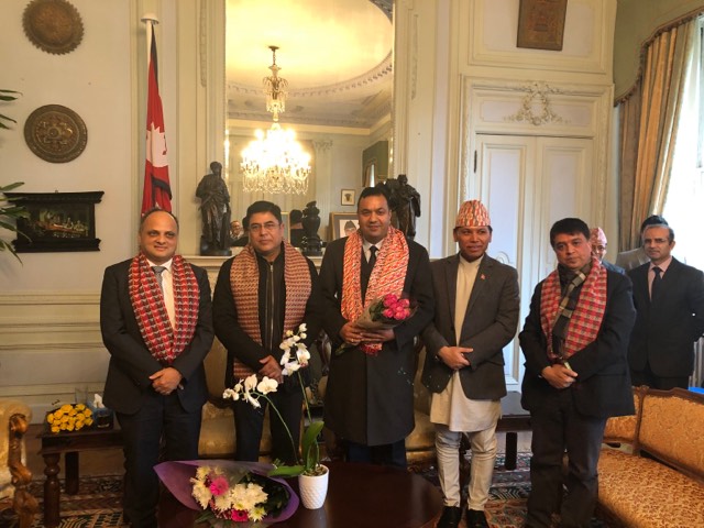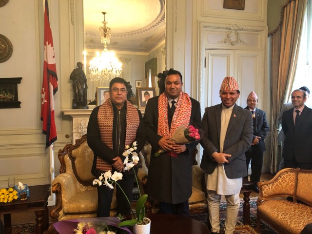 लन्डन । लन्डनस्थित नेपाली राजदूतावासले गैर आवासीय नेपाली संघ (एनआरएनए) का नवनिर्वाचित पदाधिकारीहरुलाई स्वागत तथा सम्मान गरेको छ । मंगलबार दिउसो दूतावासमा आयोजित एक कार्यक्रममा राजदूत डा. दुर्गाबहादुर सुवेदी र बेलायत भ्रमणमा रहेका नेपाल राष्ट्र बैंकका गभर्नर डा. चिरन्जिवी नेपालले एनआरएनए अध्यक्ष भवन भट्ट एवं उपाध्यक्षद्वय कुमार पन्त र कुल आचार्यलाई औपचारिक बधाइसहित सम्मान गरेका हुन् ।