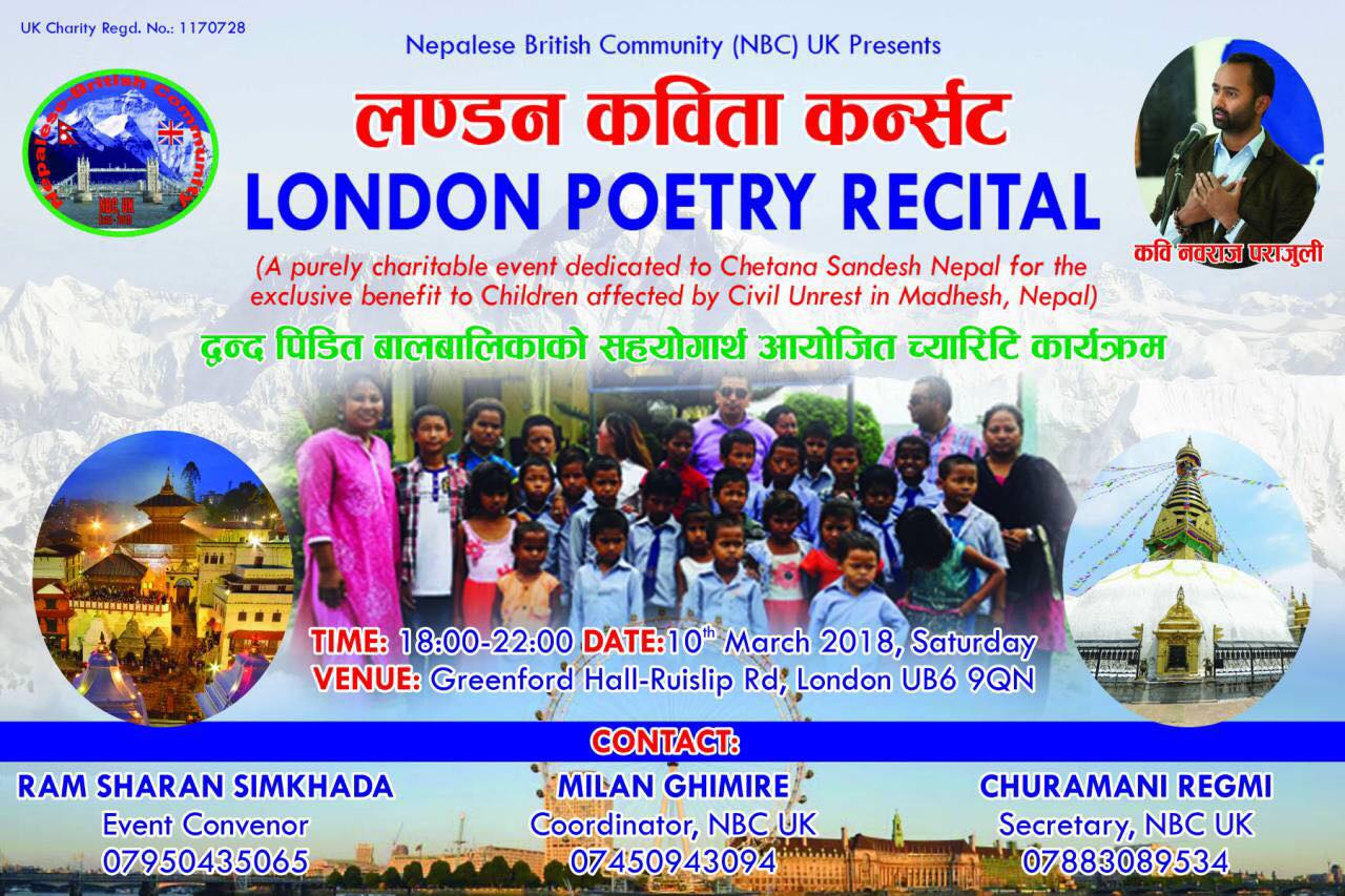 लन्डन– द्वन्द्वपीडित बालबालिकाको सहयोगका लागि लन्डनमा पहिलो पटक ‘लन्डन कविता कन्सर्ट’ च्यारीटी नाइट हुने भएको छ ।