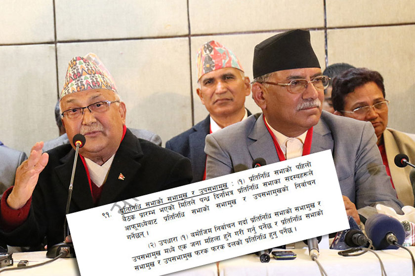 काठमाडौँ- नयाँ संविधानको धारा ९१(२) मा प्रतिनिधिसभाको सभामुख र उपसभामुखमध्ये एक महिला र यी दुवै पदमा फरकफरक पार्टीबाट आउनुपर्ने भन्ने स्पष्ट भनिएको छ । एउटै पार्टी बनाउने भन्दै एउटै चुनावी घोषणापत्र र प्रतिवद्धता सार्वजनिक गरेका एमाले–माओवादी एकीकरणको अन्तिम तयारीमा छन् ।