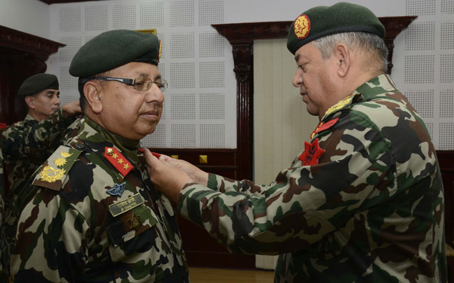 काठमाडौं, १६ फागुन । रथी पदमा हालै बढुवा भएका राजेन्द्र क्षत्रीलाई प्रधानसेनापति गौरव शम्शेर जबराले आज दर्ज्यानी चिन्ह प्रदान गरेका छन् ।