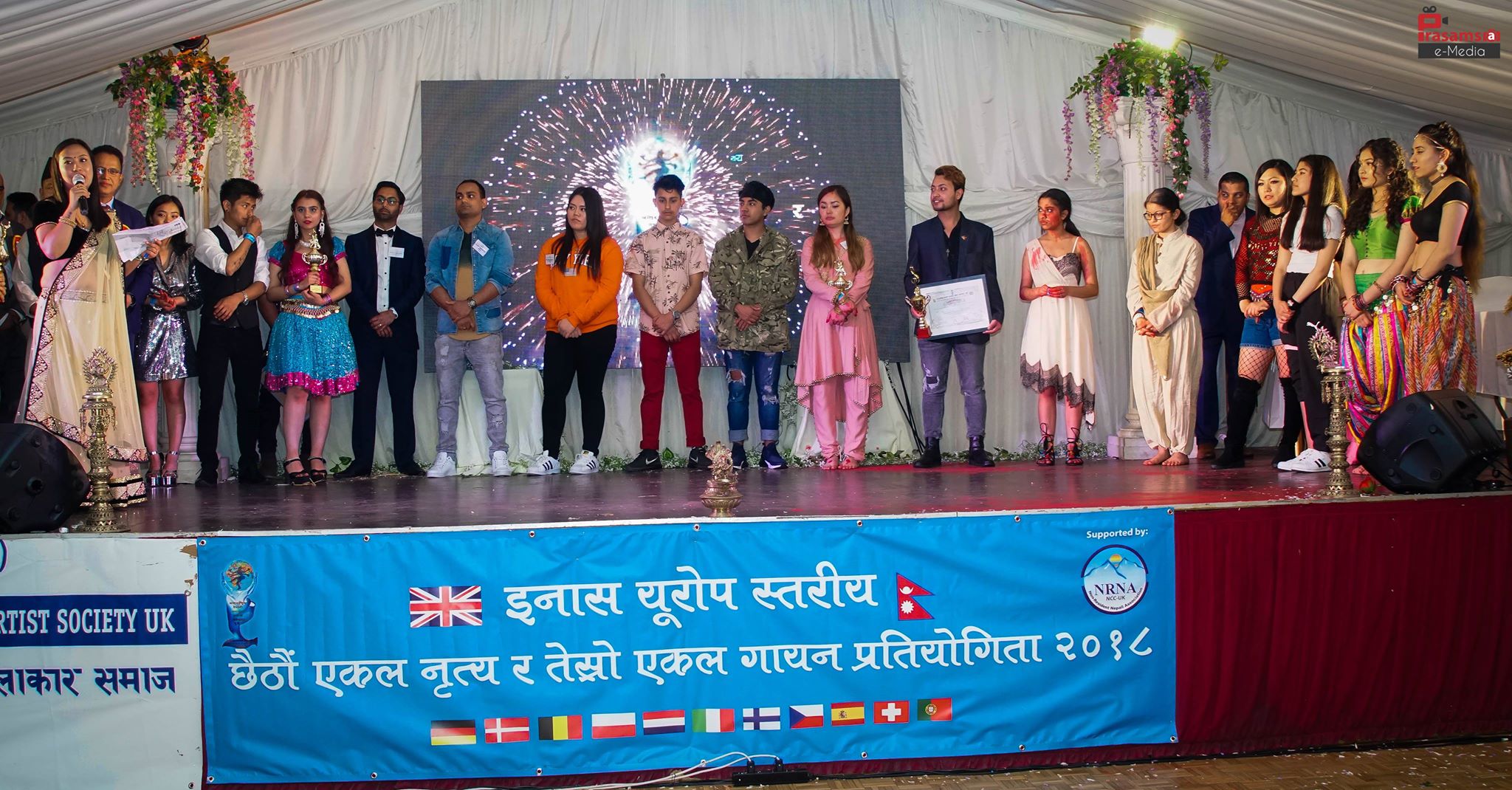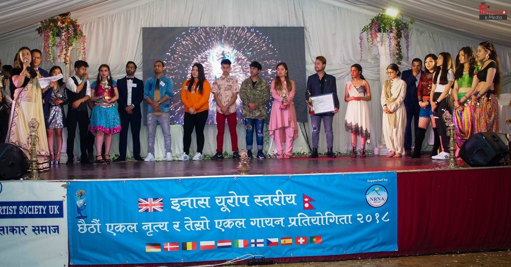 लण्डन । अन्तर्राष्ट्रिय नेपाली कलाकार समाज ( ईनास) को बेलायत तथा युरोप शाखाको आयोजनामा सम्पन्न युरोपस्तरीय नेपाली नृत्य तथा गायन प्रतियोगिता भव्य रुपमा लण्डनमा सम्पन्न भएको छ । बिदेशी भुमीमा नेपाली कला, संगीतबाट विजेता बनेका नेपाली कलाकारहरुलाई विशेष सम्मान गरिएको हो ।
