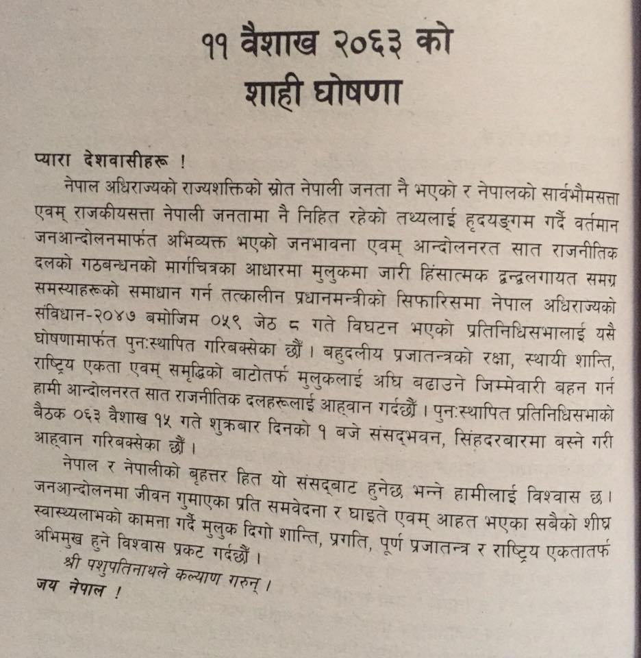 लोकतन्त्र फर्काउने यस्तो थियो ज्ञानेन्द्रको घोषणा (पूर्णपाठ)