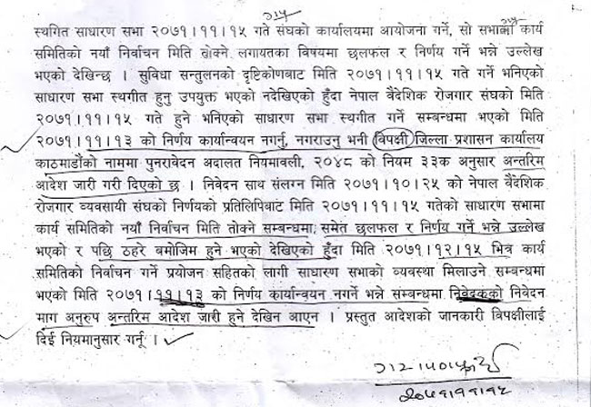 पुनरावेदन अदालत पाटनका न्यायाधीश नारायणप्रसाद श्रेष्ठको एकल इजलासले वैदेशिक रोजगार ब्यवसायी संघका नाममा अन्तरिम आदेश जारी गर्दै जिल्ला प्रशासन कार्यालयको निर्णय कार्यान्वयन नगर्नु भनी शुक्रबार फैसला सुनाएको थियो ।