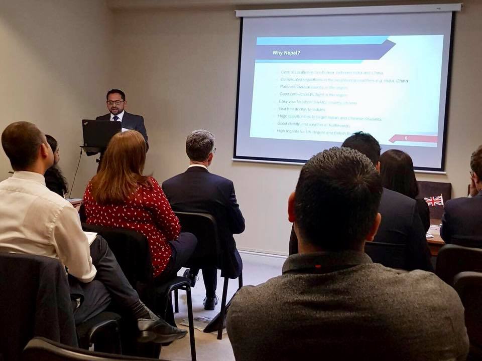 त्यसअवसरमा केपिएमजी इण्डियाकी स्नेहा जोसेफले नेपालको शिक्षा क्षेत्रबारेको एक रिपोर्ट प्रस्तुत गर्दै बेलायती एजुकेसन प्रोभाइडरुहरुका लागि सम्भाव्य मार्केटको बारेमा जानकारी दिइन् । स्कटल्याण्डको राष्ट्रिय अवार्डिङ निकाय एसक्युएकी प्रतिनिधी एसलिङ केलीले बेलायत तथा नेपालको शिक्षा क्षेत्रकाबीचको सहकार्यबारे एक प्रिजेन्टेसन गरिन् । बेलायत तथा नेपालका शिक्षा क्षेत्रसंग निकट कार्यक्रमका सहभागीहरुले नेपालमा बेलायती एजुकेसन प्रोभाइडरहरुका लागि रहेका अवसरहरुबारे अन्तरक्रियात्मक छलफल समेत गरेका थिए ।