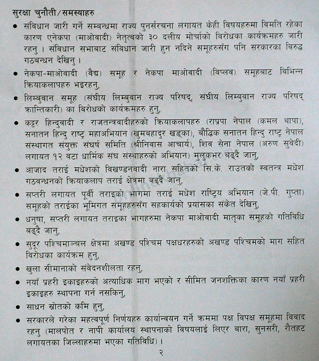 सुरक्षा चुनौतीको पहिलो नम्बरमा एमाओवादी अध्यक्ष प्रचण्ड नेतृत्वको ३० दलीय मोर्चाको आन्दोलनलाई राखिएको छ । सुरक्षा चुनौतीको कारण उल्लेख गर्दै गृहमन्त्रीले भने-‘संविधान जारी गर्ने सम्वन्धमा राज्य पुनःसंरचना लगायतका केही विषयमा विमति रहेका कारण एमाओवादी नेतृत्वको ३० दलीय मोर्चाको विरोध कार्यक्रमहरु जारी रहनु ।’