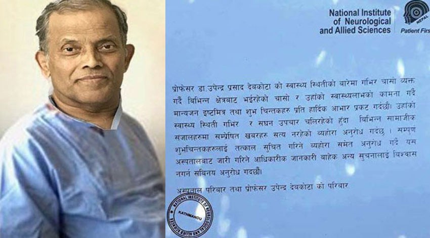 Issuing a press release on Dr Devkota’s health condition today, the Institute said that there is no any truth in the news about Dr Devkota’s health that is making rounds in the social networking sites. It has urged one and all not to go by the misleading information other than the official information disseminated by the hospital.