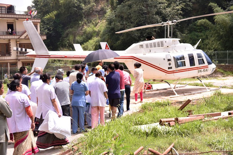 डा देवकोटालाई लिएर जाँदा दुई हेलिकोप्टर गोरखा गएका थिए । उहाँसँग न्यूरो अस्पतालमा उहाँको उपचारमा खटिएका एनेस्थेसियाका चिकित्सक डा मायुस मुनाकर्मी, मेडिसिटी अस्पतालमा कार्यरत एभिएसन तालीम प्राप्त इमरजेन्सी विशेषज्ञ डा कार्की, मेडिसिटीकै प्यारामेडिक्स रमेश न्यौपाने, डा देवकोटाकी श्रीमती मधु दीक्षित, उहाँका छोरी र एक आफन्त गोरखा जानुभएको थियो ।