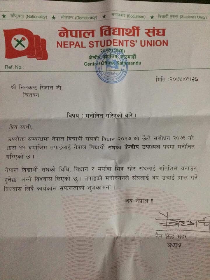 संघका अध्यक्ष नैन सिंह महरले पुर्व सहमहामन्त्री एवं प्रभावशाली युवा नेता रिजाललाई संघको विद्यानको २०२७ को छटौं संशोधन २०७३ को धारा ११ बमोजिम उपाध्यक्षमा मनोनित गर्नुभएको हो ।