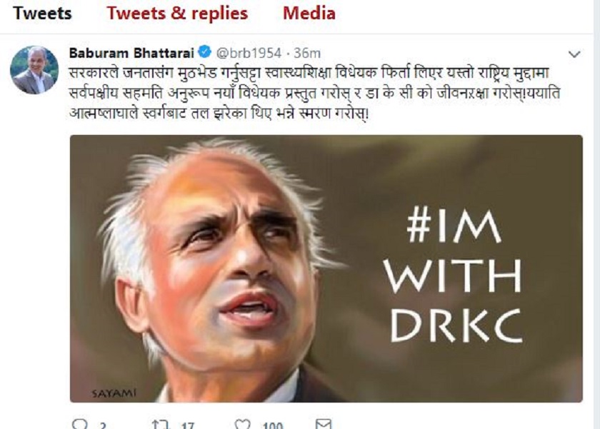 बिहिबार डा. भट्टराईले ट्वीट गर्दै सोही मुद्धाको कार्यान्वयनको माग राख्दै अनसनरत डा.गोविन्द केसीको जीवनरक्षाको माग समेत गरेका छन् ।