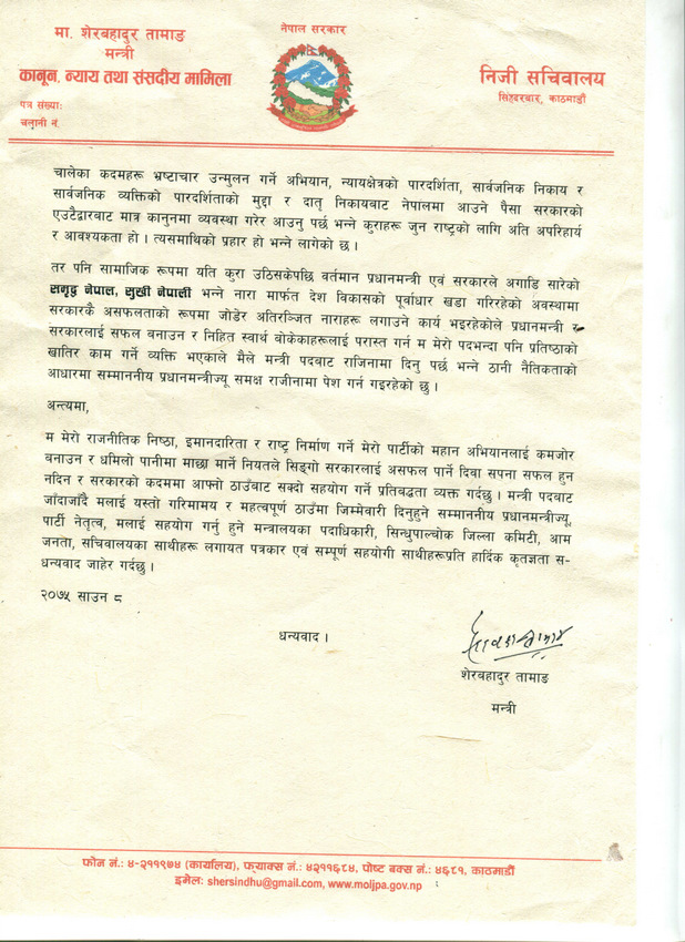 सिंहदरवारस्थित मन्त्रालयमा पत्रकार सम्मेलन गरेर मन्त्री तामाङले राजीनामाको घोषणा गरेका हुन् ।