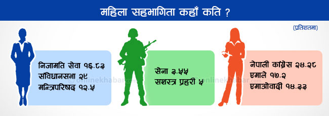women's-participationसंयुक्त राष्ट्र संघीय मानवअधिकार उच्चाउयुक्तको कार्यालयलाई बुझाउन नेपालले तयार पारेको प्रतिवेदन अनुसार नेपालका निजामति कर्मचारीहरुमा महिला सहभागिता १६.८३ प्रतिशतमात्रै देखाइएको छ ।