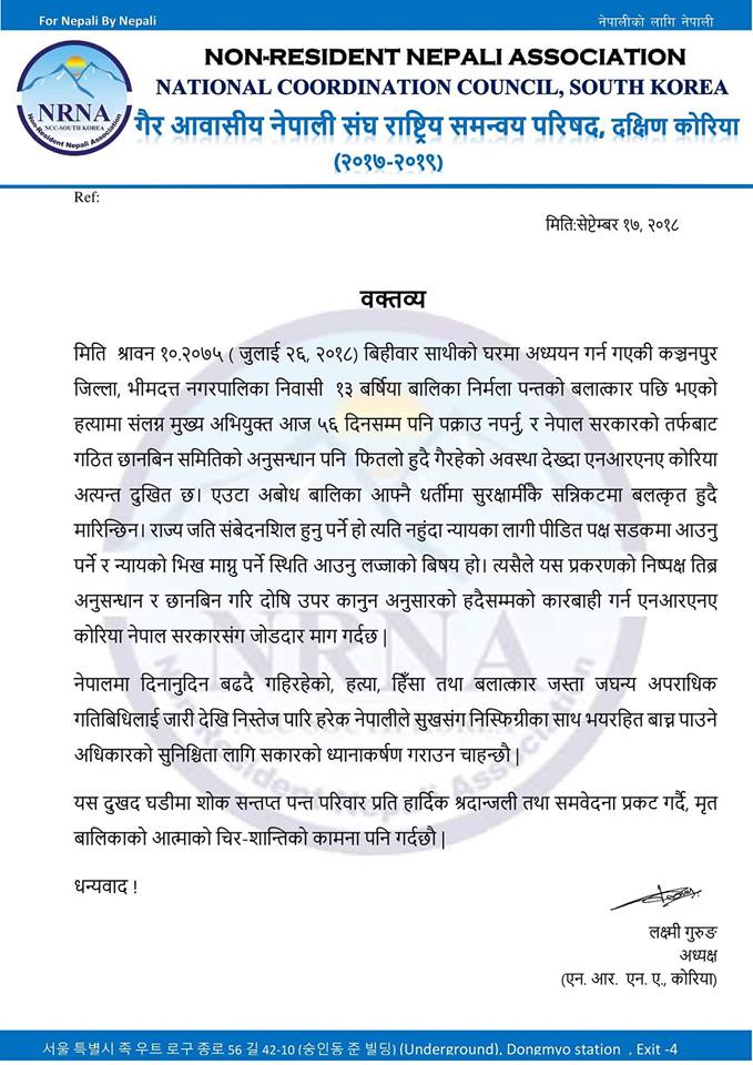 उनले भनेकी छिन, ‘एउटा अवोध बालीका आफनै धर्तीमा सुरक्षाकर्मीकै सक्रिटमा बलात्कृत हुँदै मारिन्छिन् । राज्य जति सम्बेदनशील हुनुपर्ने हो त्यती नहुँदा न्यायका लागि पीडित पक्ष सडकमा आउनु पर्ने स्थिति आउनु लज्जाको विषय हो । त्यसैले यस प्रकारको निस्पक्ष तीब्र अनुसन्धान र छानवीन गरि दोषी उपर कानुन अनुसारको हदैसम्मको कारवाही गर्न एनआरएन कोरिया सरकारसँग जोडदार माग गर्दछ ।’