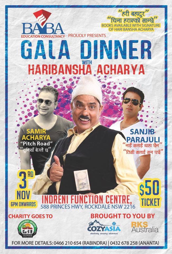 बाबा एजुकेसन कन्सल्टेन्सीले अस्ट्रेलियाको सिड्नी मा एउटा बिशेस गाला डिनरको आयोजना गर्ने भएको छ l नेपाली हाँस्यब्यङ्ग्य एबम कलाकारिता क्षेत्रका बहुप्रतिभाशाली कलाकार हरिवंश आचार्य को उपस्थिति मा उक्त गाला डिनर हुने भएको हो l कार्येक्रममा वरिष्ठ कलाकार आचार्य का अलवा गायक सन्जिब पराजुली र समिर आचार्य को बेजोड प्रस्तुति अनि सिड्नी का चर्चित नेपाली डान्ससर्स को उतक्रिस्ट डान्स रहने छ l कार्येक्रमको ब्यापक तयारी भएको बताउनु हुन्छ- आयोजक एबम बाबा एजुकेसन कन्सल्टेन्सी का सी ई ओ रबिन्द्र कुमार शर्मा l कोजी एशिया र आर के एस अस्ट्रेलियाले आयोजना को जिम्मा लिएको यो कार्येक्रम मेलबोर्न मा २७ अक्टोबर र एडीलेडमा २८ अक्टोबर मा पनि हुने भएको छ l