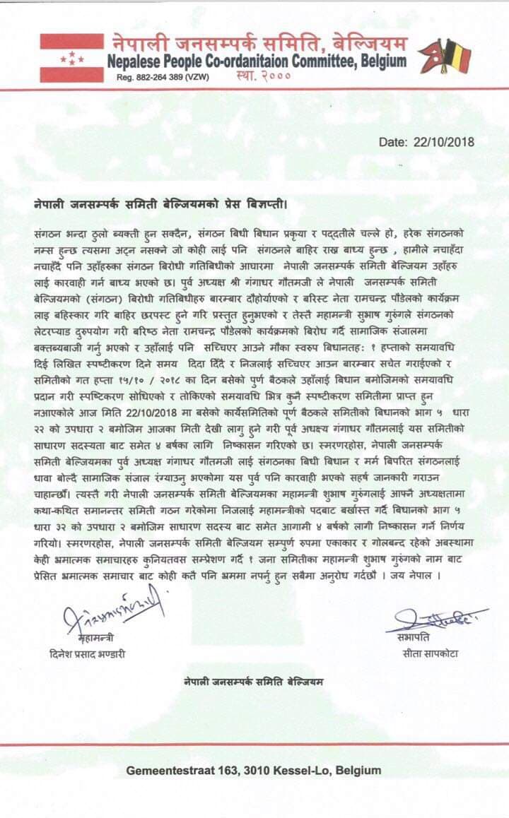 यसैबीच, बेल्जियमस्थित नेपाली कांग्रेसको भातृसंस्था नेपाली जनसम्पर्क समिति औपचारिक रुपमा विभाजन भएको छ । नेपाली जनसम्पर्क समितिका महामन्त्री सुभाष गुरुङको नेतृत्वमा आइतवार राति लुभेनमा भएको एक भेलाले वर्तमान सभापति सीता सापकोटाको नेतृत्व नमान्ने घोषणा गर्दै नयाँ कार्यसमिति गठन गरेको छ।
