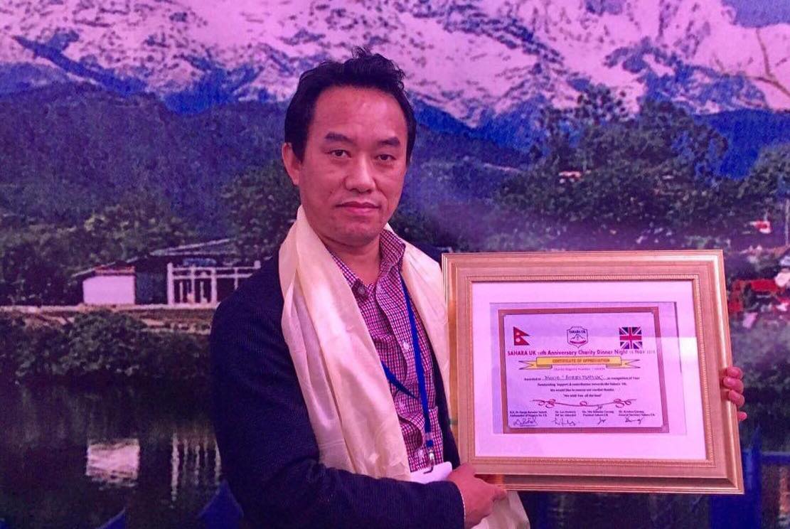 सहारा युकेको दशौं वर्षगांठको अवसरमा आयोजित च्यारिटी डिनर समारोहमा बबी फिल्म समूह युकेको तर्फबाट क्रिस गुरुङ, सबिन्द्र कुमार गुरुङ, सुर्य गुरुङ र शारदा गुरुङले सहारा युकेका अध्यक्ष मिन बहादुर गुरुङ (साइँला) लाई सो रकम बराबरको चेक हस्तान्तरण गरेका हुन् ।