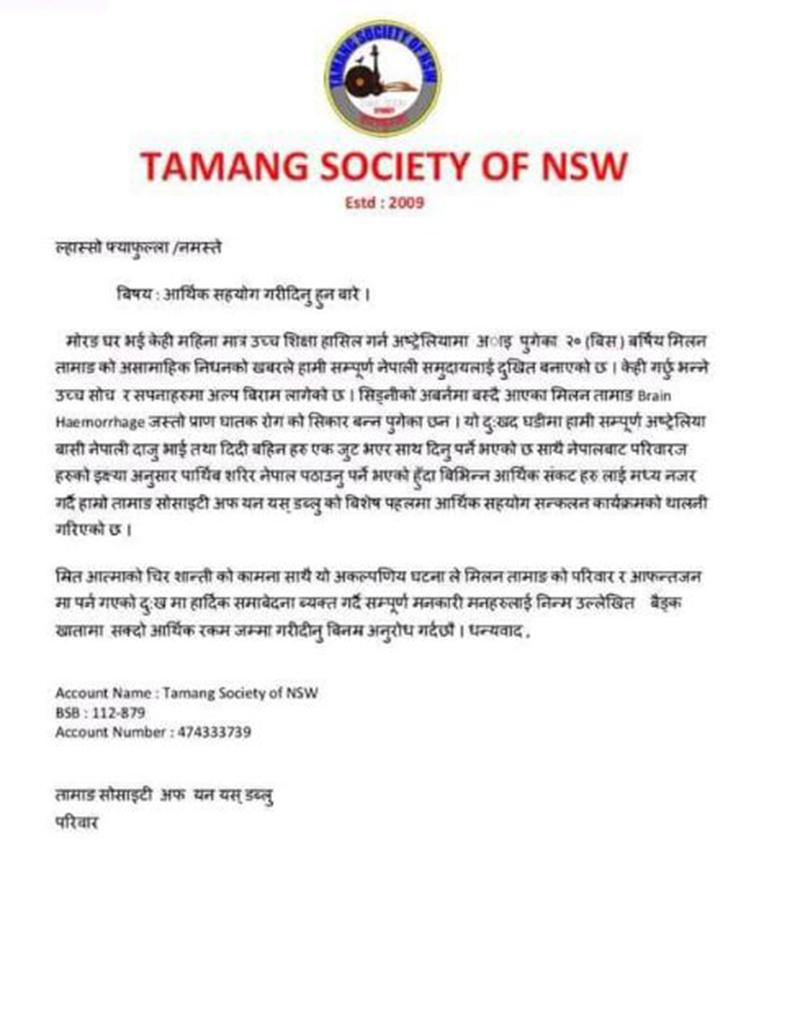 त्यस्तै स्वर्गीय मिलनको पार्थिव शरीर नेपाल पठाउन अनि परिवारको सहयोगको लागि तामाङ सोसाइटी अफ यन यस् डब्लुको विशेष पहलमा आर्थिक सहयोग संकलन अभियान पनि संचालन गरिएको छ।