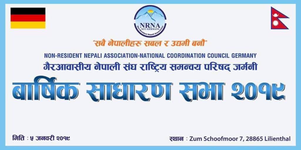 जर्मनी – गैरआवासीय नेपाली संघ (एनआरएनए ) जर्मनीको वार्षिक साधारणसभा जनवरी ५ तारिखमा हुने भएको छ । संघका अध्यक्ष बिजय मोक्तानको अध्यक्षतामा बसेको बैठकले साधारणसभा ५ जनवरीमा गर्ने निर्णय गरेको हो । निर्णयअनुसार साधारणसभाको तयारी तीब्र पारिएको छ । आगामी जनवरी ५ शनिबाका दिन ब्रेमनमा साधारणसभा आयोजना गरिने गरिने भएको हो ।