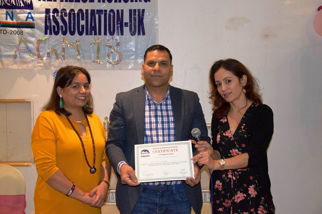 बेलायतमा पत्रकारितामार्फत नेपाली समाज र नेपाली नर्सहरुको विविध पक्षलाई उजागर गरेको भन्दै एसोसिएसनले कदर पत्र प्रदान गरेको हो ।