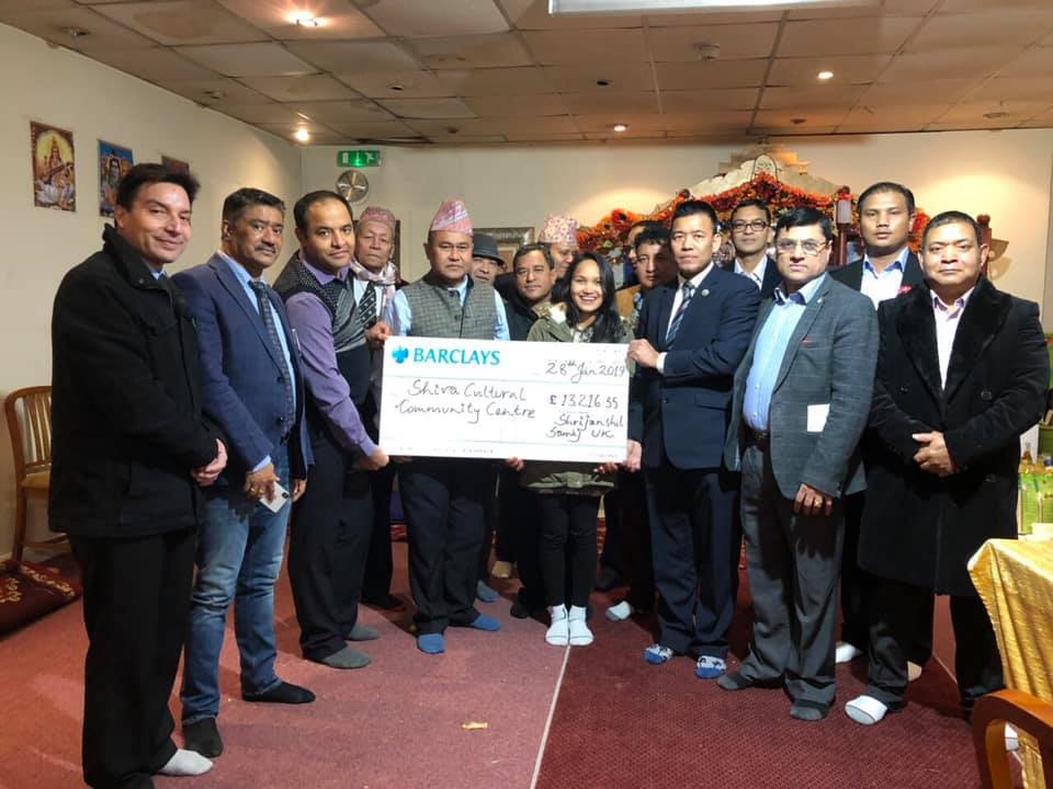 श्रृजनशील नेपाली समाज यूके शिव मन्दिर परियोजनाका संयोजक एवं समाजका निवर्तमान अध्यक्ष धनबहादुर सार्कीले कम्युनिटी सेन्टरका अध्यक्ष रोहित गुरुङलाई चेक बुझाए । सो अवसरमा श्रृजनशील नेपाली समाज यूकेको तर्फबाट प्रमुख संरक्षक एवं एनआरएनए यूकेका उपाध्यक्ष शेर सुनार, श्रृजनशिल नेपाली समाज यूकेका अध्यक्ष भक्त दर्जी, निवर्तमान अध्यक्ष धनबहादुर सार्की, उपाध्यक्ष दिलबहादुर नेपाली, खिम सदाशंकर, प्रेम विश्वकर्मा, नविन रसाईली , चेतबहादुर परियार, ओमबहादुर परियार, श्याम रिसाल र संगीता गैरेको उपस्थिति रहेको थियो । त्यस्तै, शिव कल्चरल एण्ड कम्युनिटी सेन्टर यूकेको तर्फबाट अध्यक्ष रोहित गुरुङ, महासचिव बिक्रम भट्टराई, कोषाध्यक्ष वाचस्पति रेग्मी रहेका थिए । सो अवसरमा ग्रेटर रसमुर नेपाली कम्युनिटी यूकेका अध्यक्ष जीवन बेल्वासेको विशेष उपस्थिति रहेको थियो ।
