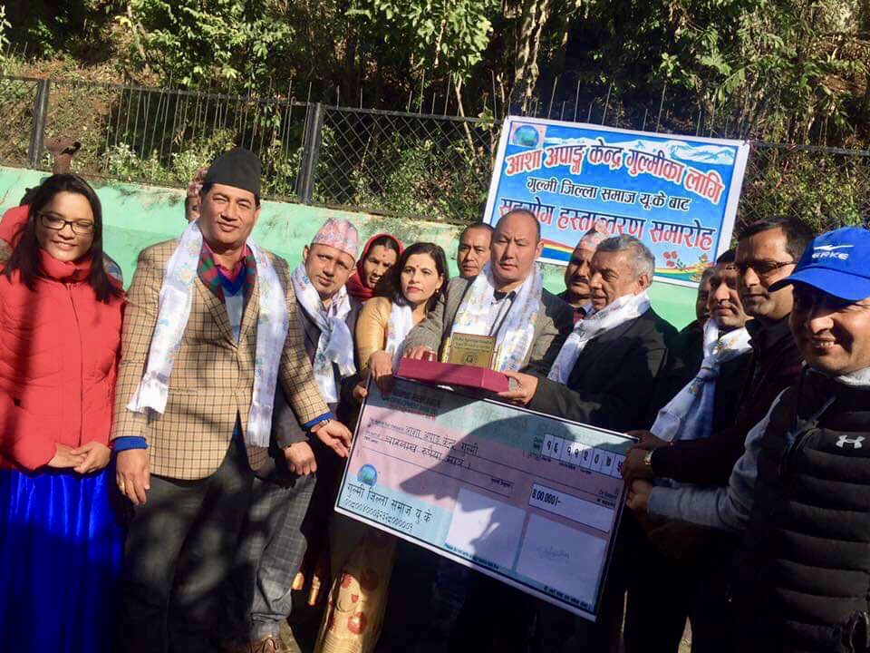 आशा अपांग केन्द्रको कार्यालयमा बिहिवार एक कार्यक्रमका बिच समाजका बिभिन्न प्रतिनिधीले हस्तातरण गरेका थिए । गुल्मी जिल्ला समाज यूकेका अध्यक्ष राम गलामी, सल्लाहाकार मोति भण्डारी, कोषाध्यक्ष तारानाथ भण्डारी,कार्यकारी सदस्य तारा भट्टराई, सदस्य बावुराम भण्डारीले आशा अअपांग केन्द्र गुल्मीा अध्यक्ष जनार्दन घिमिरेलाई प्रमुख जिल्ला अधिकारी यदुनाथ पौडेलको रोहवरमा ४ लाख रुपैयाँको चेक हस्तातरण गरेका हुन् ।