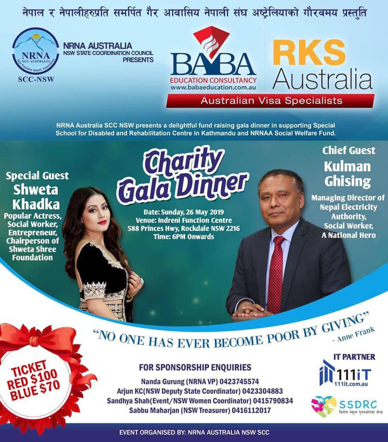 सिड्नी । गैरआवासीय नेपाली संघ (एनआरएन) अष्ट्रेलियाले आयोजना गरेको च्यारिटी गाला डिनरमा सहभागी हुन नेपालबाट कुलमान घिसिङ, श्वेता खड्का र सविता उप्रेती सिड्नी आउने भएका छन् । एनआरएन अस्ट्रेलियाले हिजो आइतबार आयोजना गरेको पत्रकार सम्मेलनमा उपाध्यक्ष नन्द गुरुङले भने, ‘एनआरएन अष्ट्रेलिया समाज कल्याण कोषको सहयोगार्थ आयोजना गरिएको गाला डिनरबाट संकलित रकम अटिजम भएका बालबालिकाका लागि सञ्चालित विद्यालय र पुनस्र्थापना सुधार केन्द्रमा खर्च गरिनेछ । एनआरएनका धेरै सफल कार्यक्रम मध्ये यो पनि एक हो ।’