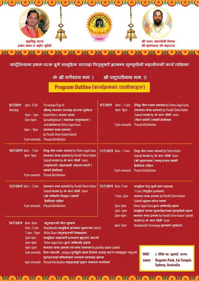समाजका अध्यक्ष प्रचना शर्माले सभापतित्व गरेको उद्घाटन कार्यक्रम अघि शोभा कलश यात्रा निकालिएको थियो । भागवत ज्ञान महायज्ञ रिजन्टपार्क साइ टेम्पल सिड्नीमा पण्डित कुँवेर सुवेदीले भागवत वाचन गर्नुहुनेछ । अस्ट्रेलियामा आयोजना भएको यो पहिलो कार्यक्रम हो । कार्यक्रम जुलाई ८–१४ सम्म सञ्चालन हुनेछ ।