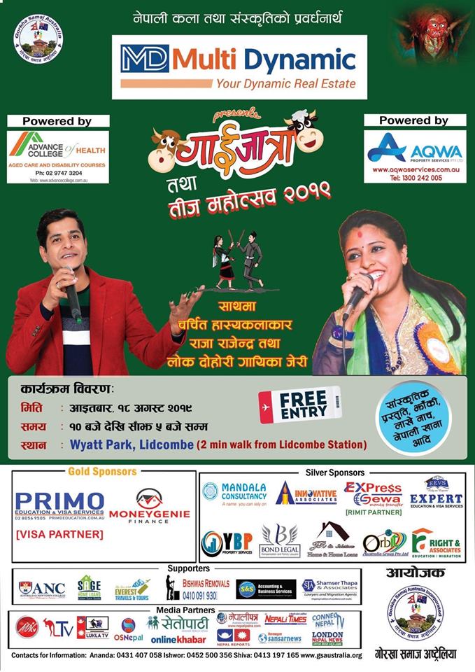 अस्ट्रेलियामा आयोजना हुने विभिन्न कार्यक्रममा साथ र सहयोग गर्दै आएको मल्टी डाइनामिक रियलस्टेटले गोरखा समाजले आयोजना गरेको गाईजात्रा तथा तीज कार्यक्रमलाई पनि प्रायोजन गरेको छ । रियलस्टेटका प्रिन्सिपल मेघराज पौडेलले भने “अस्ट्रेलियावासी नेपाली समुदायको साथ र विश्वासले हामी यहाँसम्म आइपुगेका हौं, नेपाली समुदायलाई जुटाउने यस्ता सामाजिक कार्यक्रममा सहयोग गर्न पाउँदा हामीलाई खुशी लागेको छ ” । इभेन्ट पार्टनरमा एन्डभान्स कलेज अफ हेल्थ र अक्वा प्रोपर्टी सर्भिसेस रहेका छन् भने प्रिमो एजुकेसन एन्ड भिसा सेर्भिसेस भिसा पार्ट्नर्मा रहेका छन ।