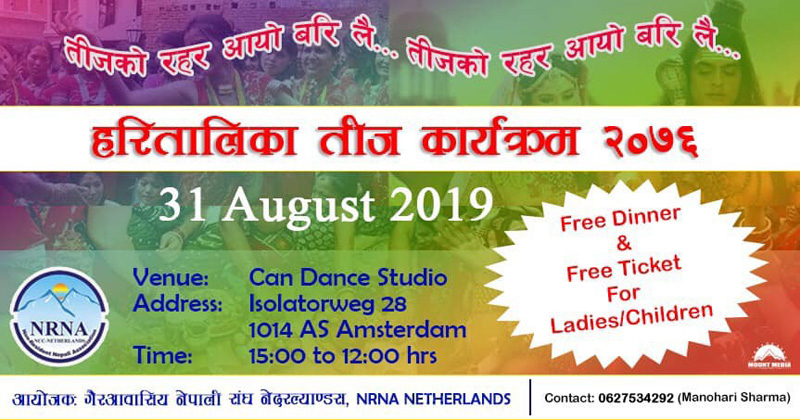 नेदरल्यान्ड । गैरआवासीय नेपाली संघ राष्ट्रिय समन्वय परिषद नेदरल्यान्ड्सले अगस्ट ३१ तारिखका दिन नेपाली महिला दिदीबहिनीहरुको महान चाड हरितालिका तिज भब्य रुपमा मनाउने भएको छ ।